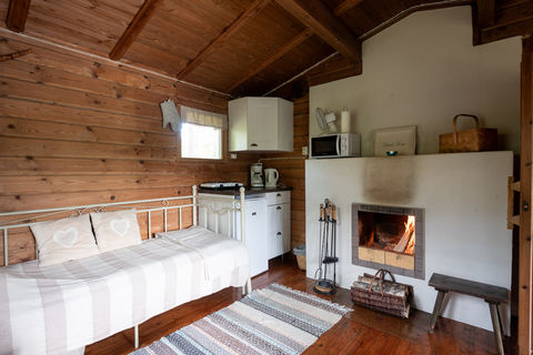 The small, sympathetic sauna cabin located on the riverside is an old-fashioned charming cabin without modern comforts, with a small fireplace, a wood-heated sauna and a breathtaking river view. The cabin is equipped with a stove, refrigerator, microwave, coffee maker, kettle and hot plate. There is no running water in the cabin, but there is electricity. There is outdoor eco toilet in the yard. Suitable, for example, for a single camper, fishermen or a peace-loving couple.